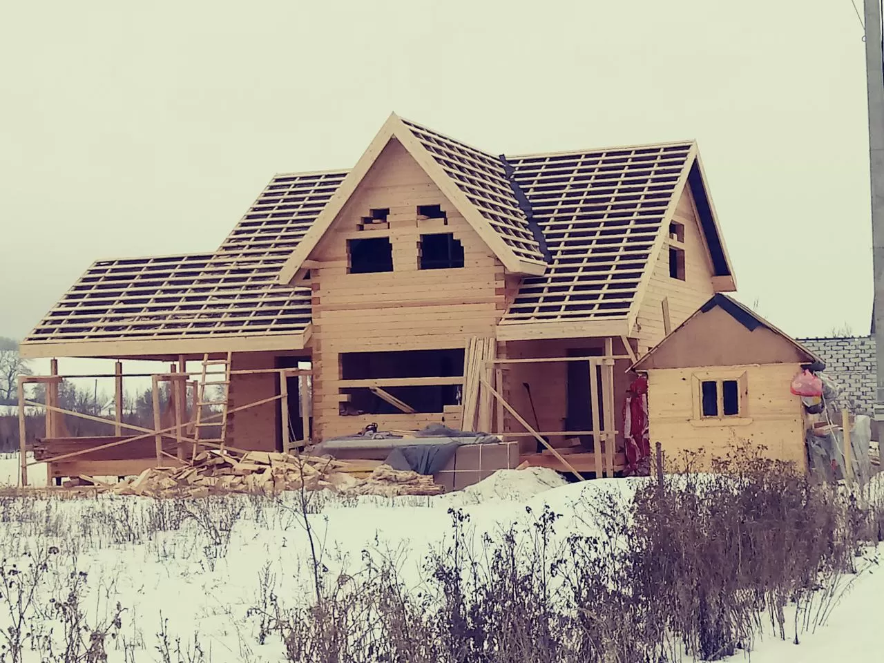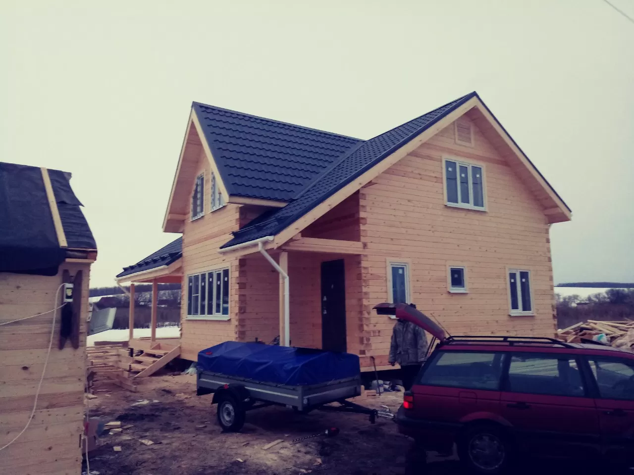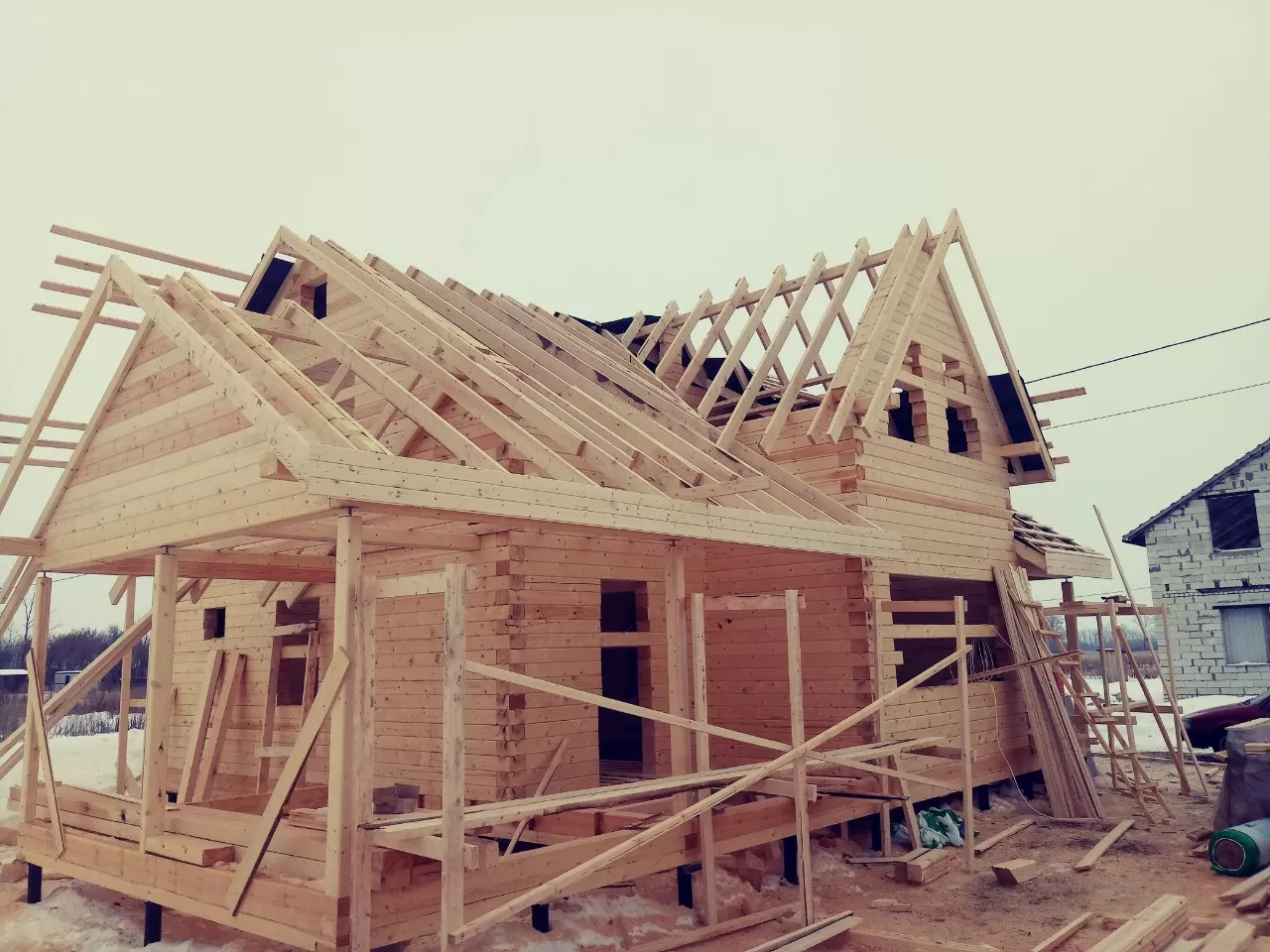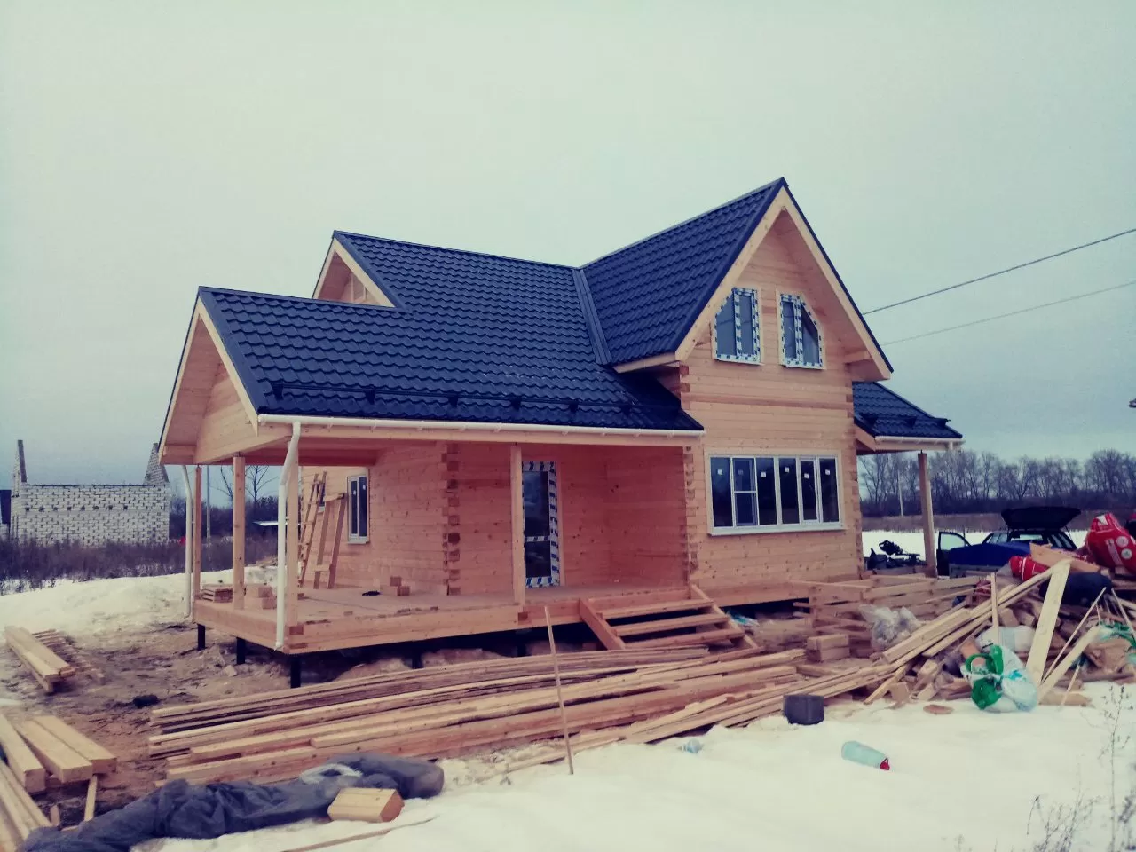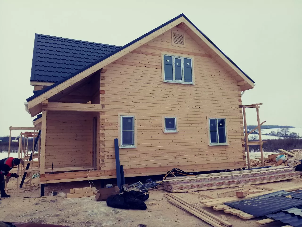 Дом построен за 46 дней. Дом из бруса камерной сушки, клиенты заказали его в начале 2017 тем самым зафиксировали стоимость на окончание года и был закончен 10 февраля 2019 года. Толщина бруса 190 мм ,экологически чистый продукт , материал ель ,сосна из зимнего леса.