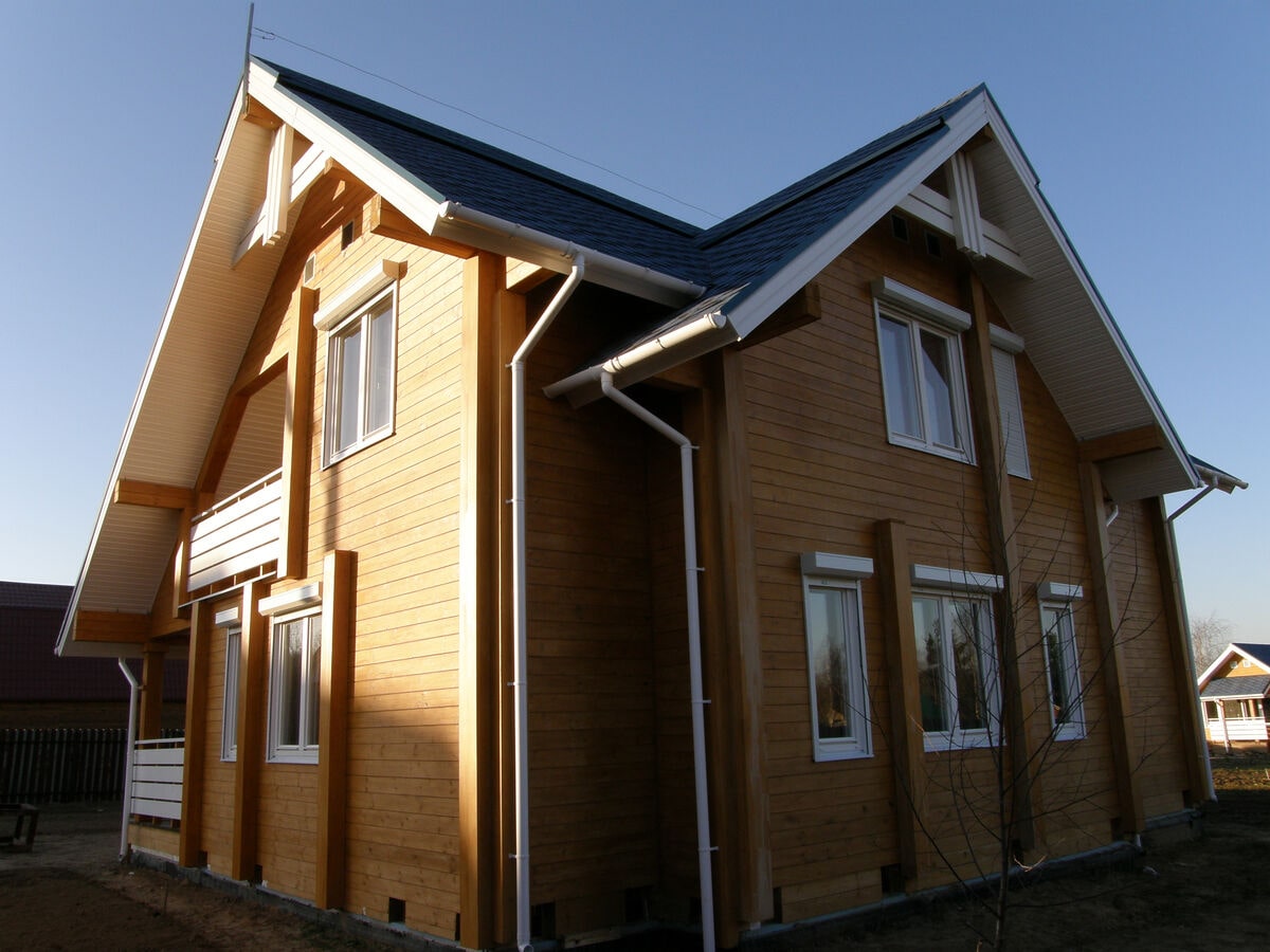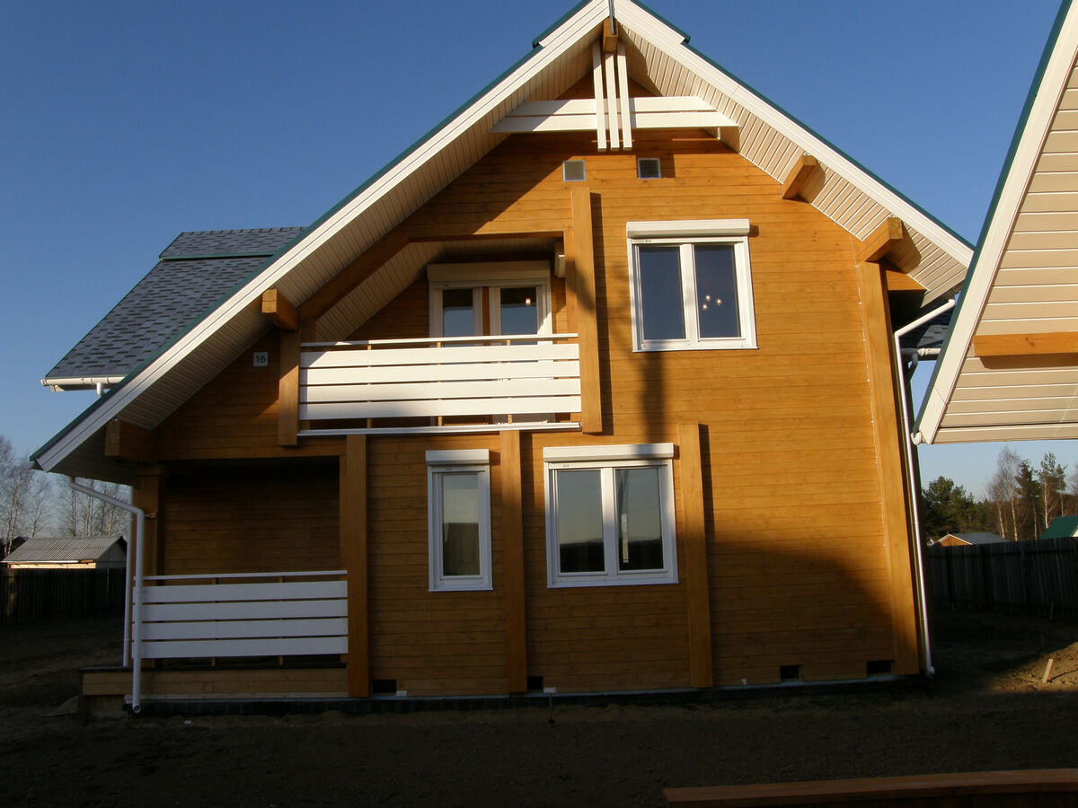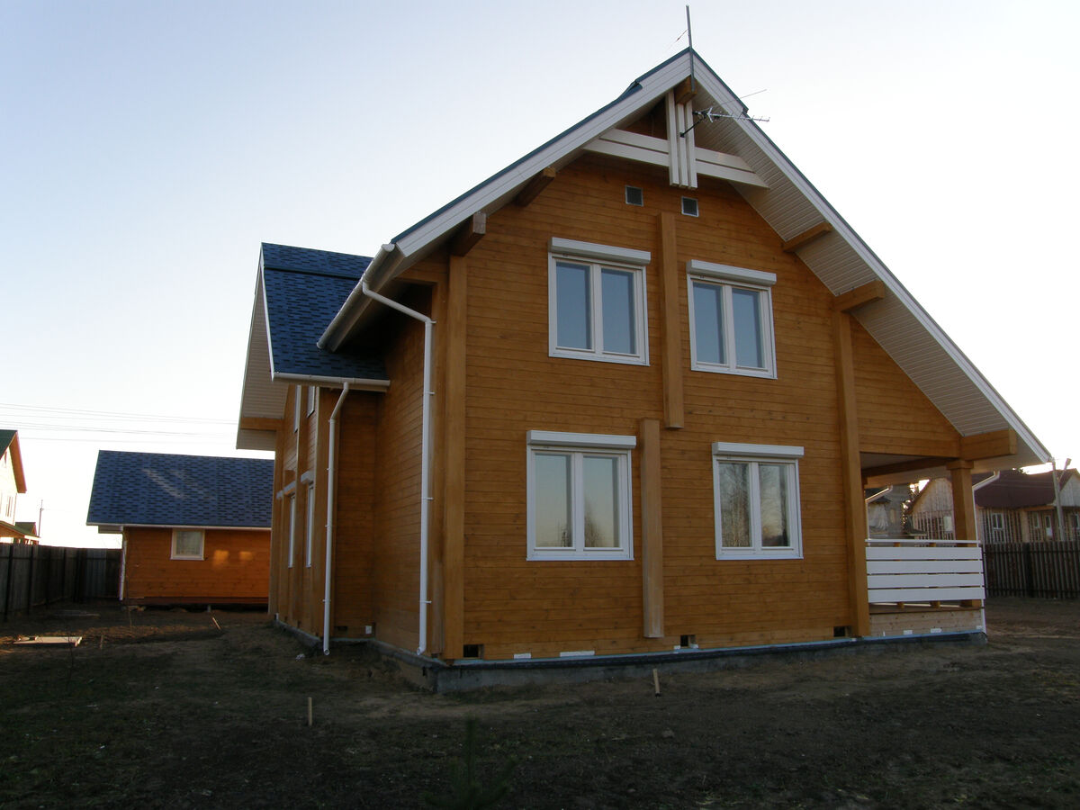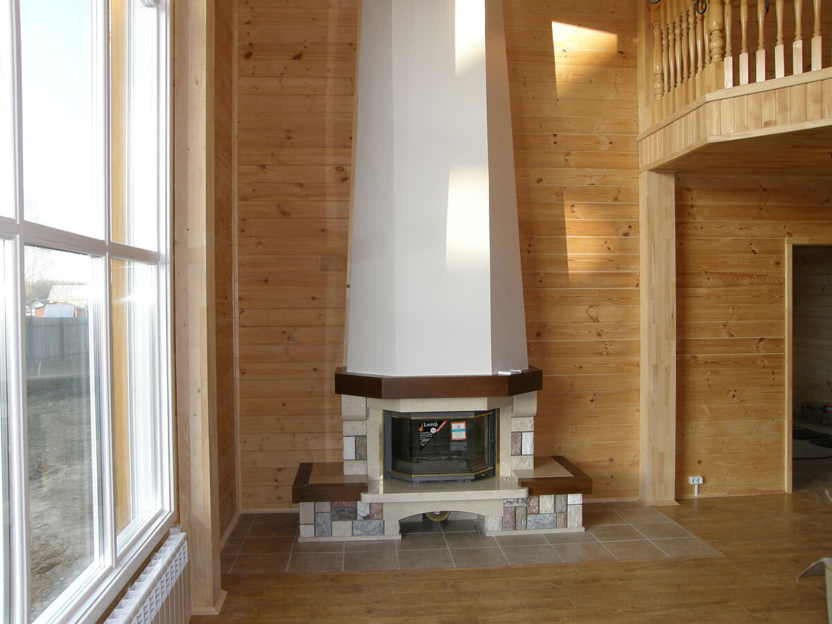 Оригинальный и просторный двухэтажный коттедж из клееного бруса с камином.