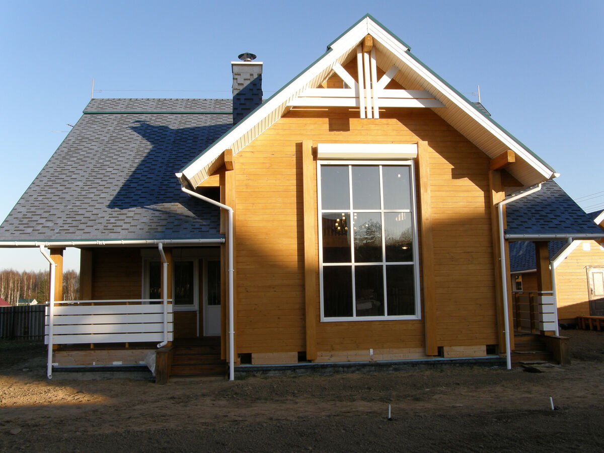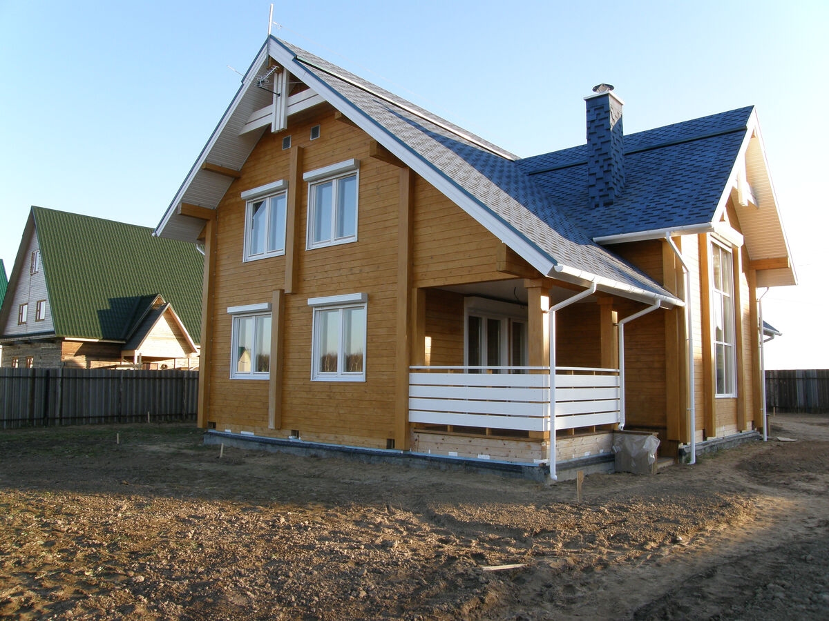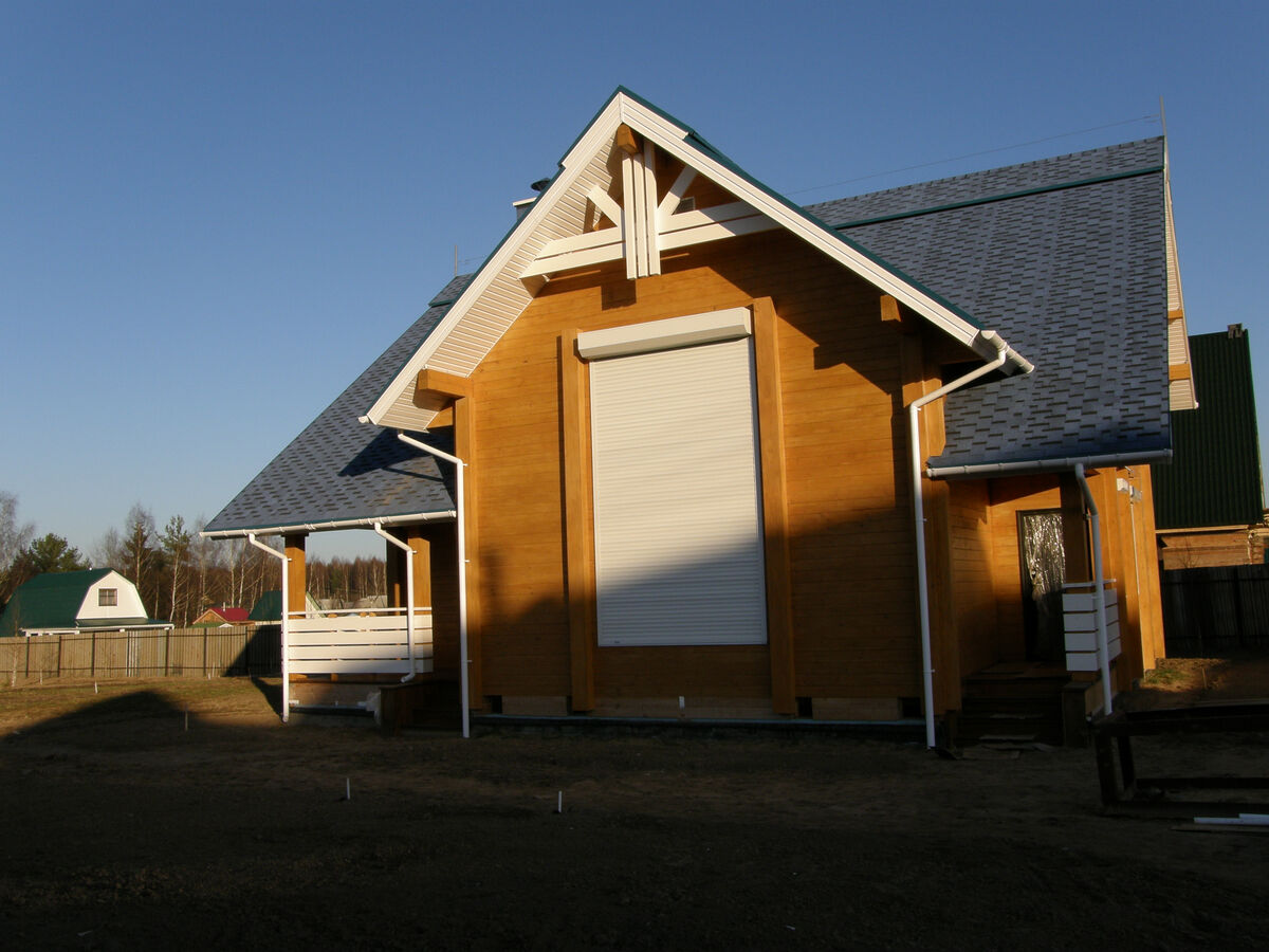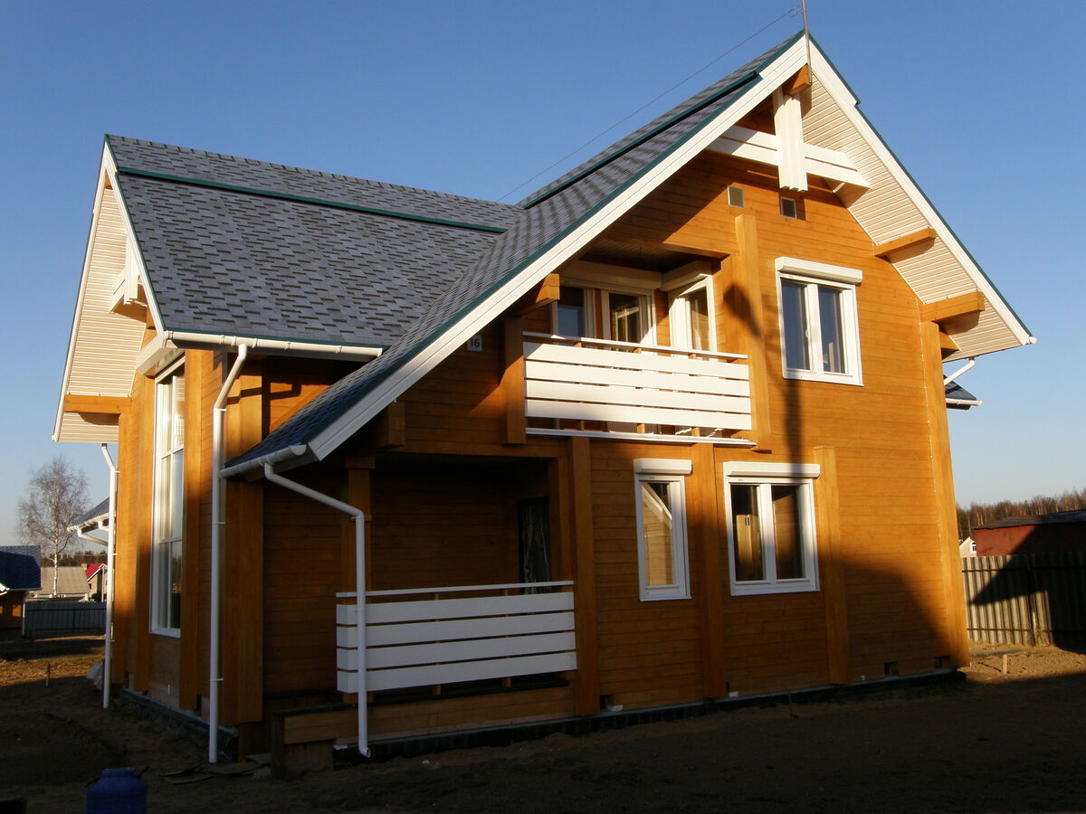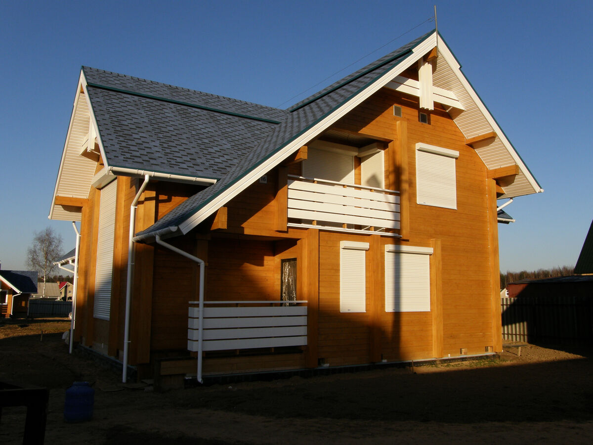 Оригинальный и просторный двухэтажный коттедж из клееного бруса с камином.